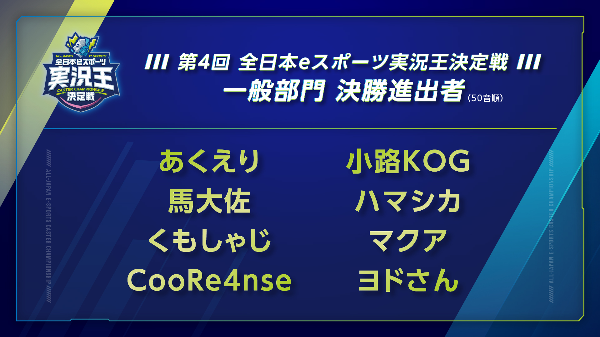 たくさんの方の応援、支えがあってこの決勝の舞台に立つことが出来ました。京都から全国へ、ストリートファイター6の面白さ、奥深さを発信できるように、アツい実況で優勝を目指して頑張ります!